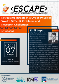 On Tuesday, 7th October at 5:30 pm, in Room R1 of the Polytechnic of Turin, there will be the fourteenth meeting of the series of seminars related to the Master's Degree in Cybersecurity.