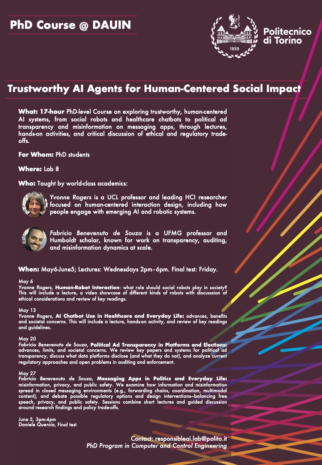 PhD-level course (17 hours) titled Trustworthy AI Agents for Human-Centered Social Impact, organized as a part of the PhD course in Computer and Control Engineering.