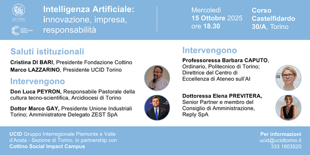 Mercoledì 15 ottobre alle 18:30 si terrà l'incontro intitolato Intelligenza Artificiale: innovazione, impresa, responsabilità. In partnership con UCID Gruppo Interregionale Piemonte e Valle d’Aosta - Sezione di Torino.